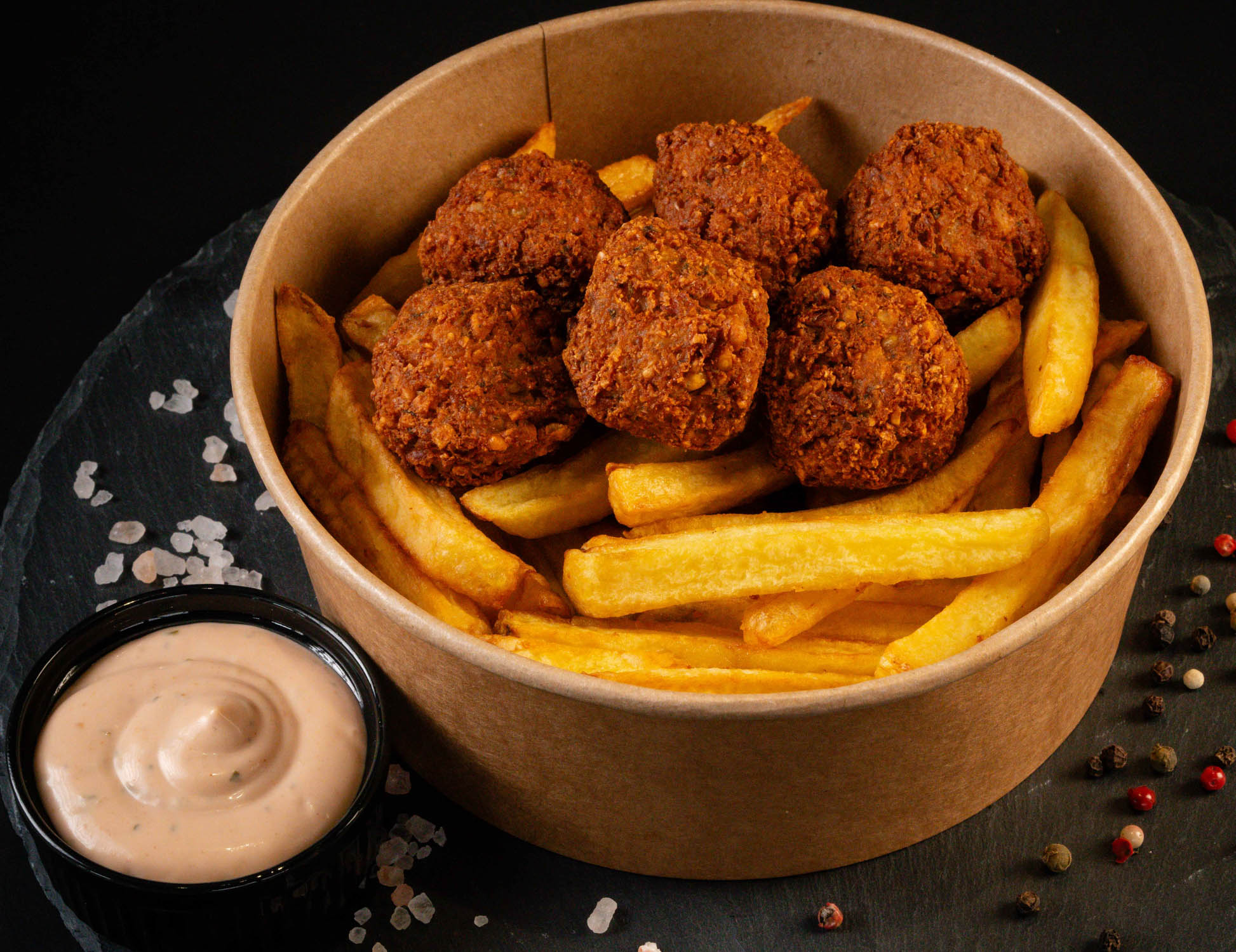 Meniurile 6 bucăți Falafel, cartofi proaspăt prăjiți, pâinică la cuptor și sosul casei