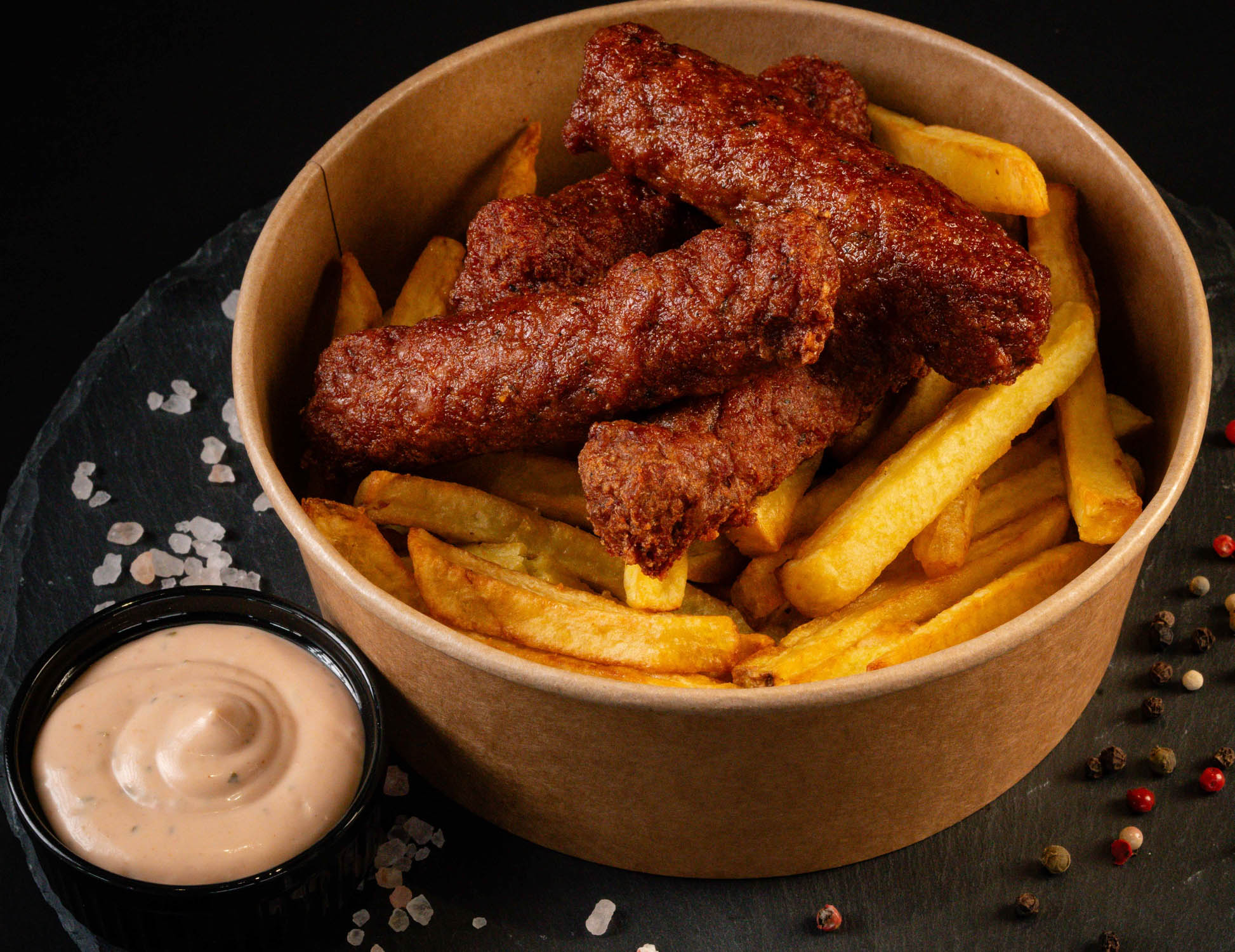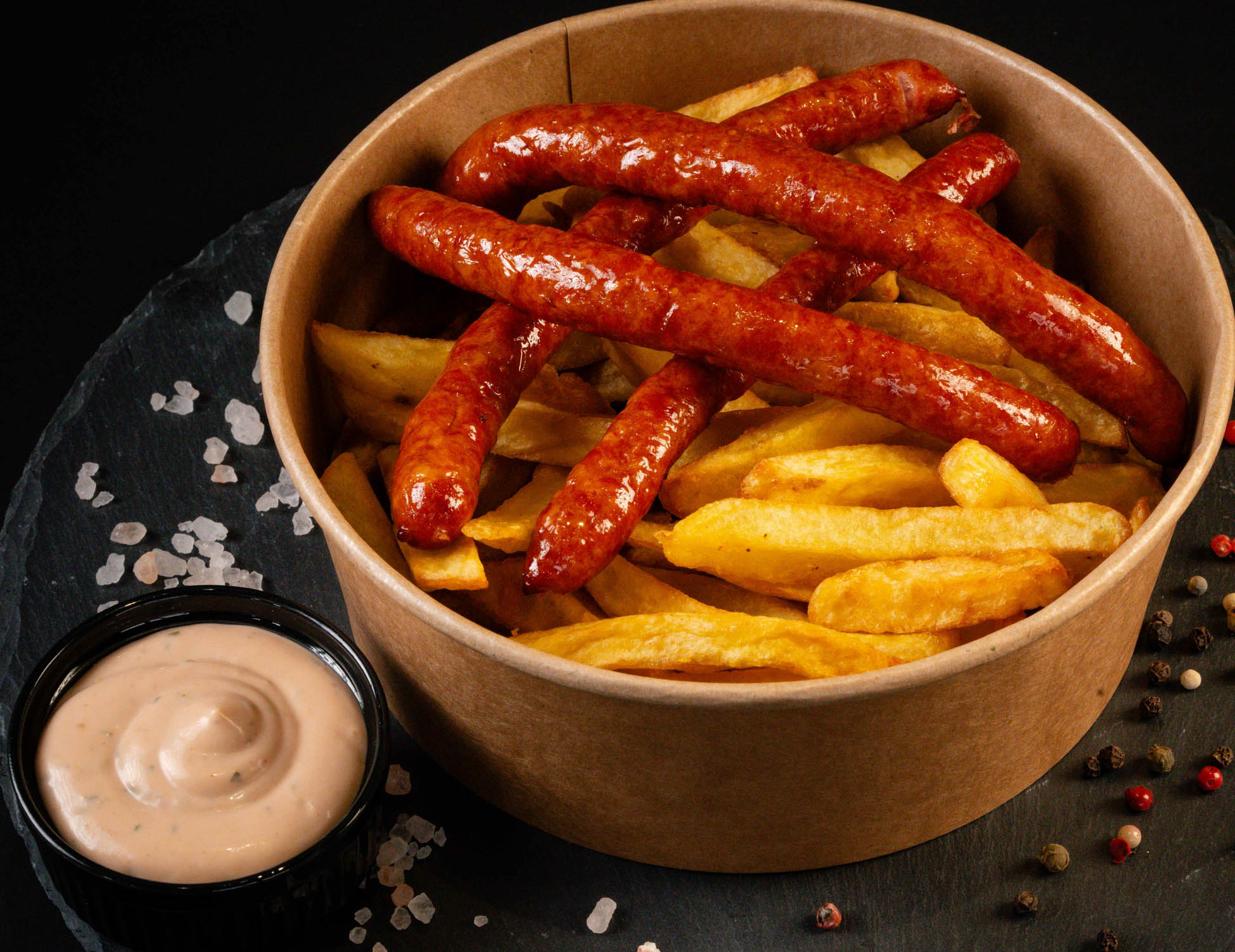 Meniurile includ 4 cârnăciori, cartofi proaspăt prăjiți, pâinică la cuptor și sos de muștar