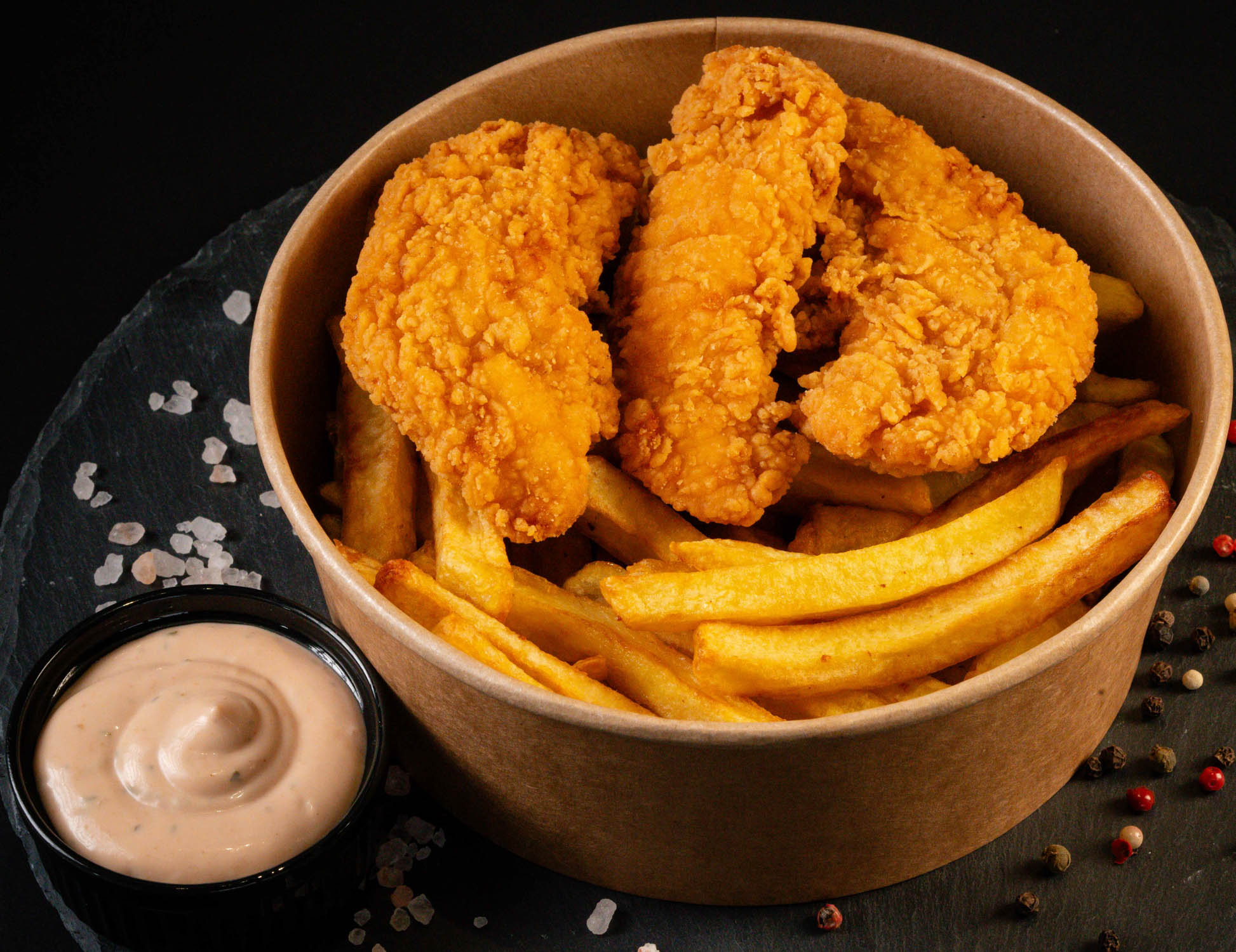 Meniurile includ crispy de pui 3 bucăți, cartofi proaspăt prăjiți, pâinică la cuptor și sosul casei