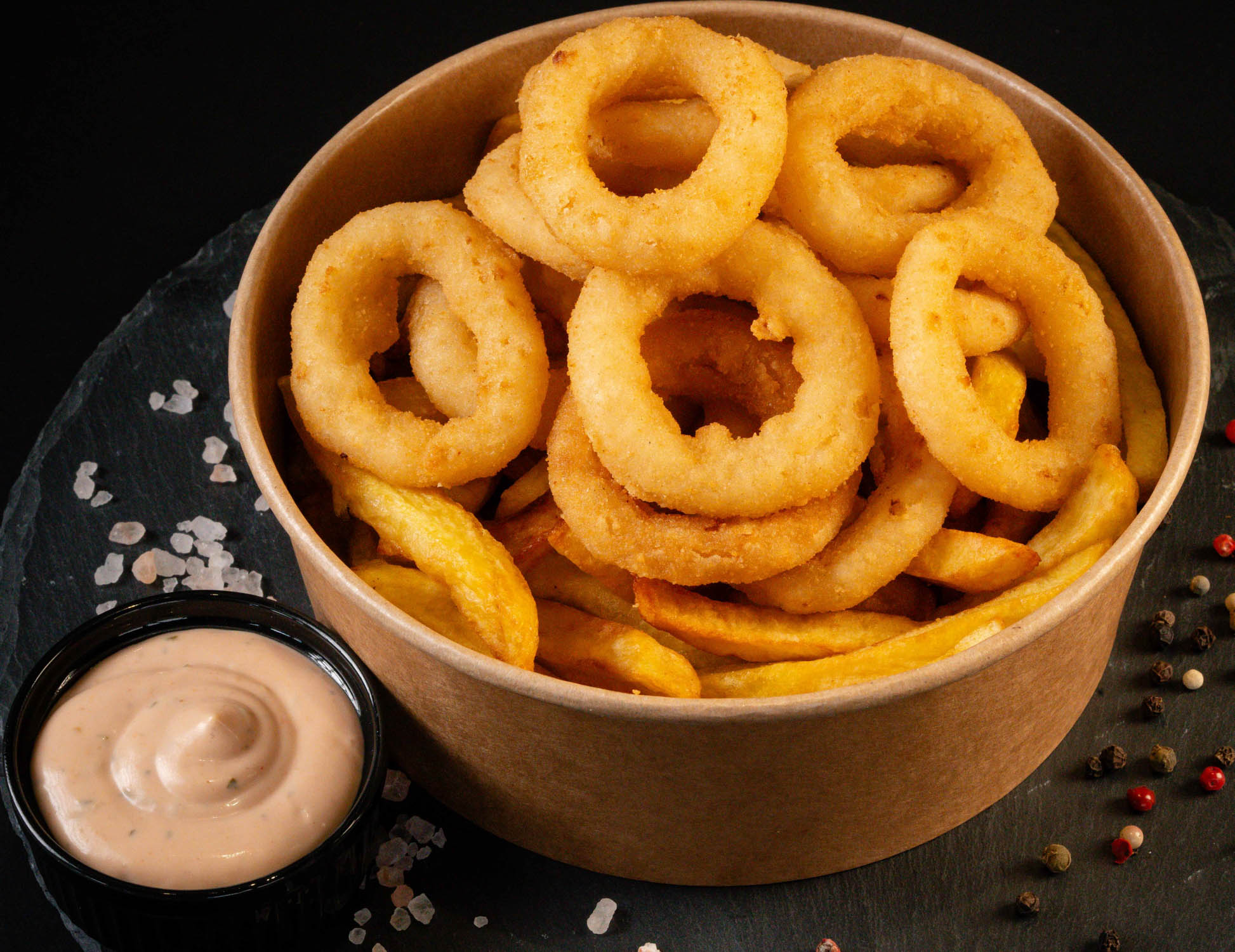 Meniurile includ 12 bucăți inele de ceapă, cartofi proaspăt prăjiți, pâinică la cuptor și sosul casei