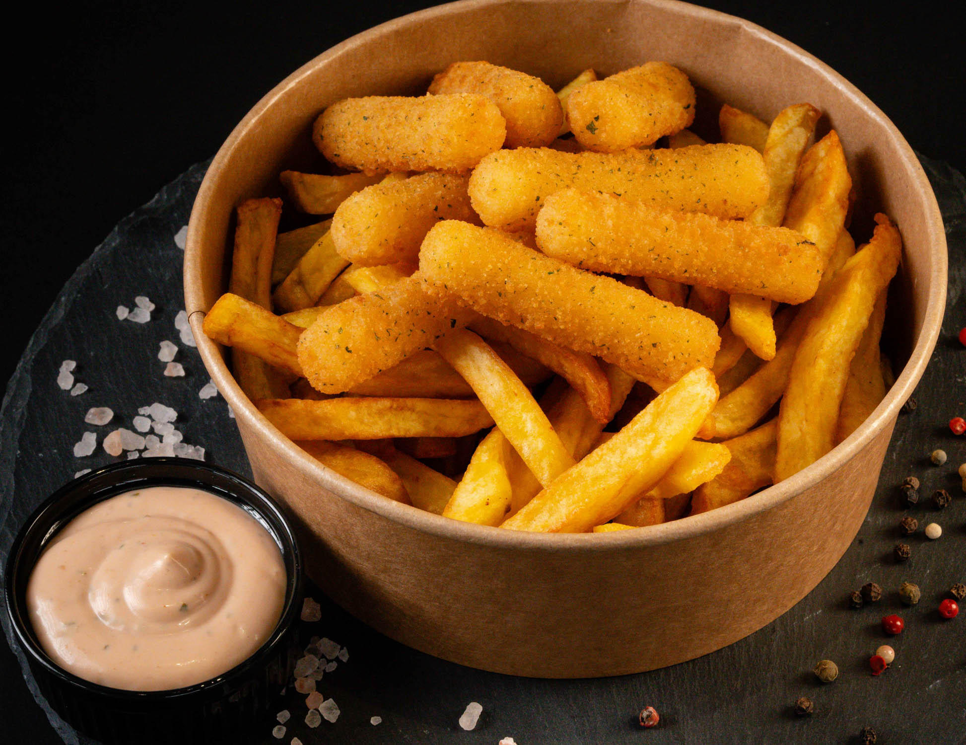 Meniurile includ 8 bucăți mozzarella sticks, cartofi proaspăt prăjiți, pâinică la cuptor și sosul casei