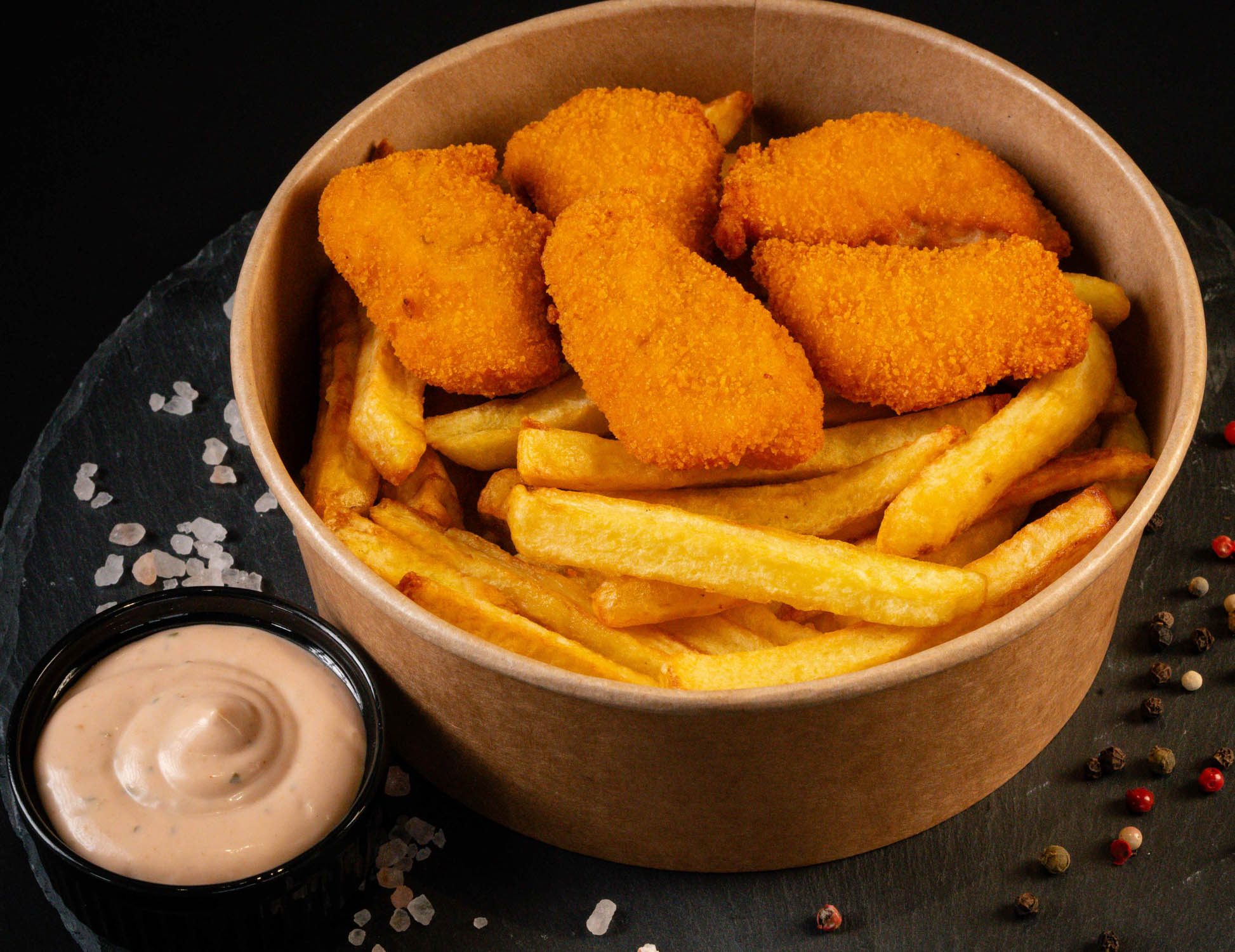 Meniurile includ nuggets 5 bucați, cartofi proaspăt prăjiți, pâinică la cuptor și sosul casei