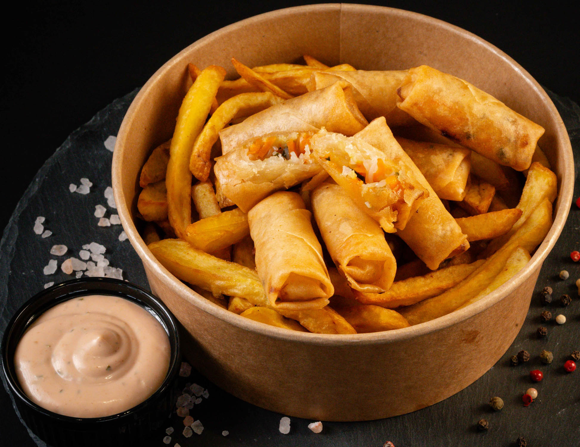 Meniurile includ 8 bucăți pachețele de primăvară, cartofi proaspăt prăjiți, pâinică la cuptor și sosul casei