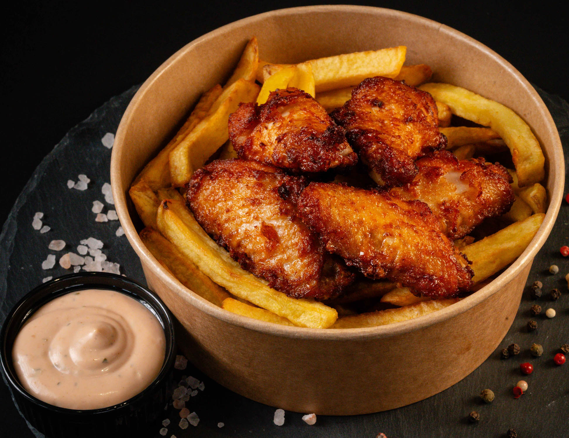 Meniurile includ 5 bucăți aripioare , cartofi proaspăt prăjiți, pâinică la cuptor și sosul casei
