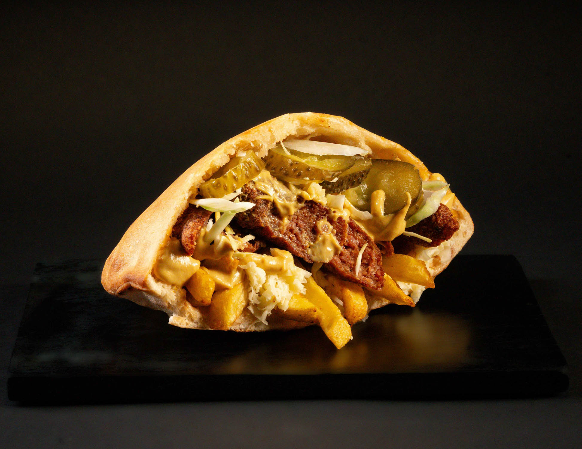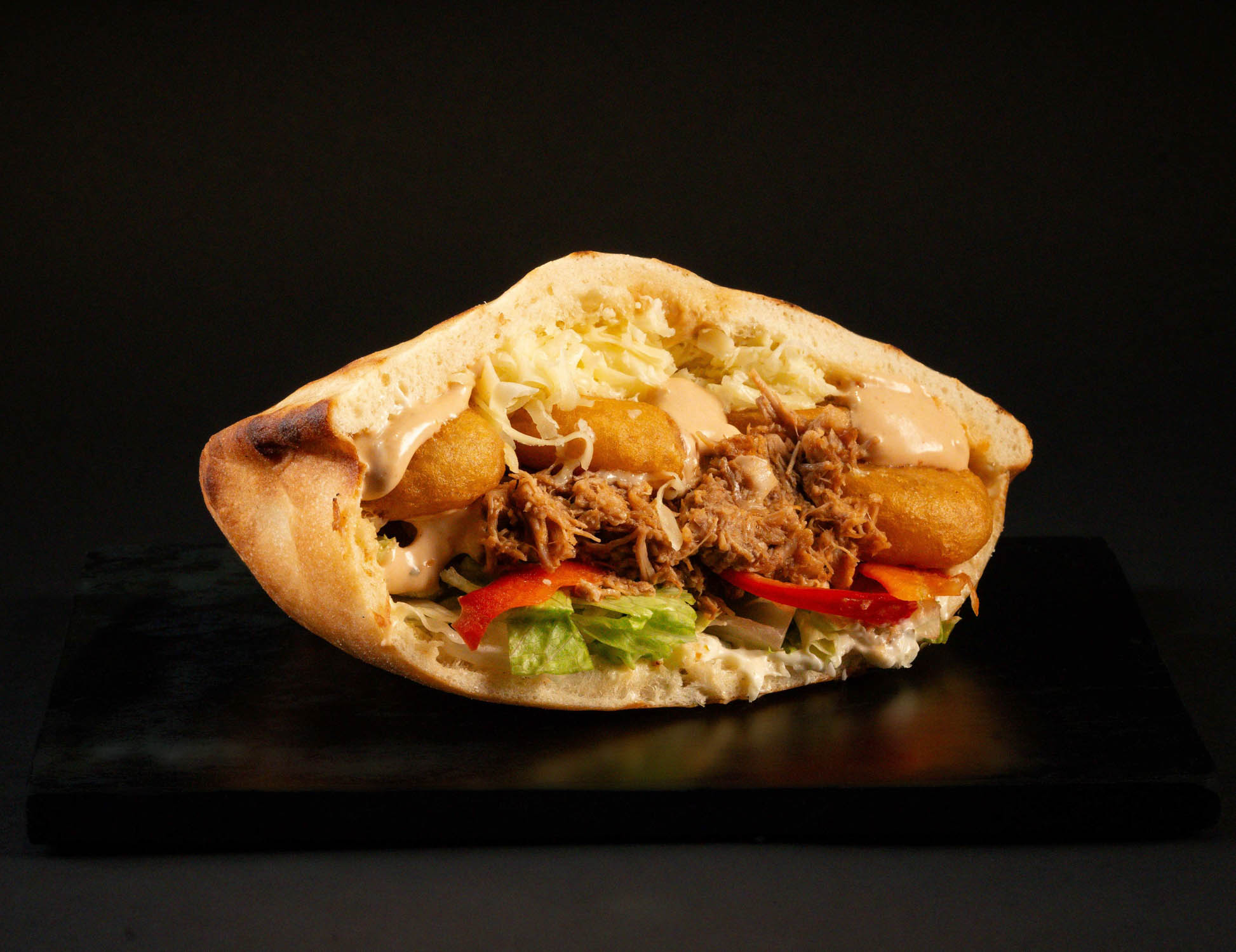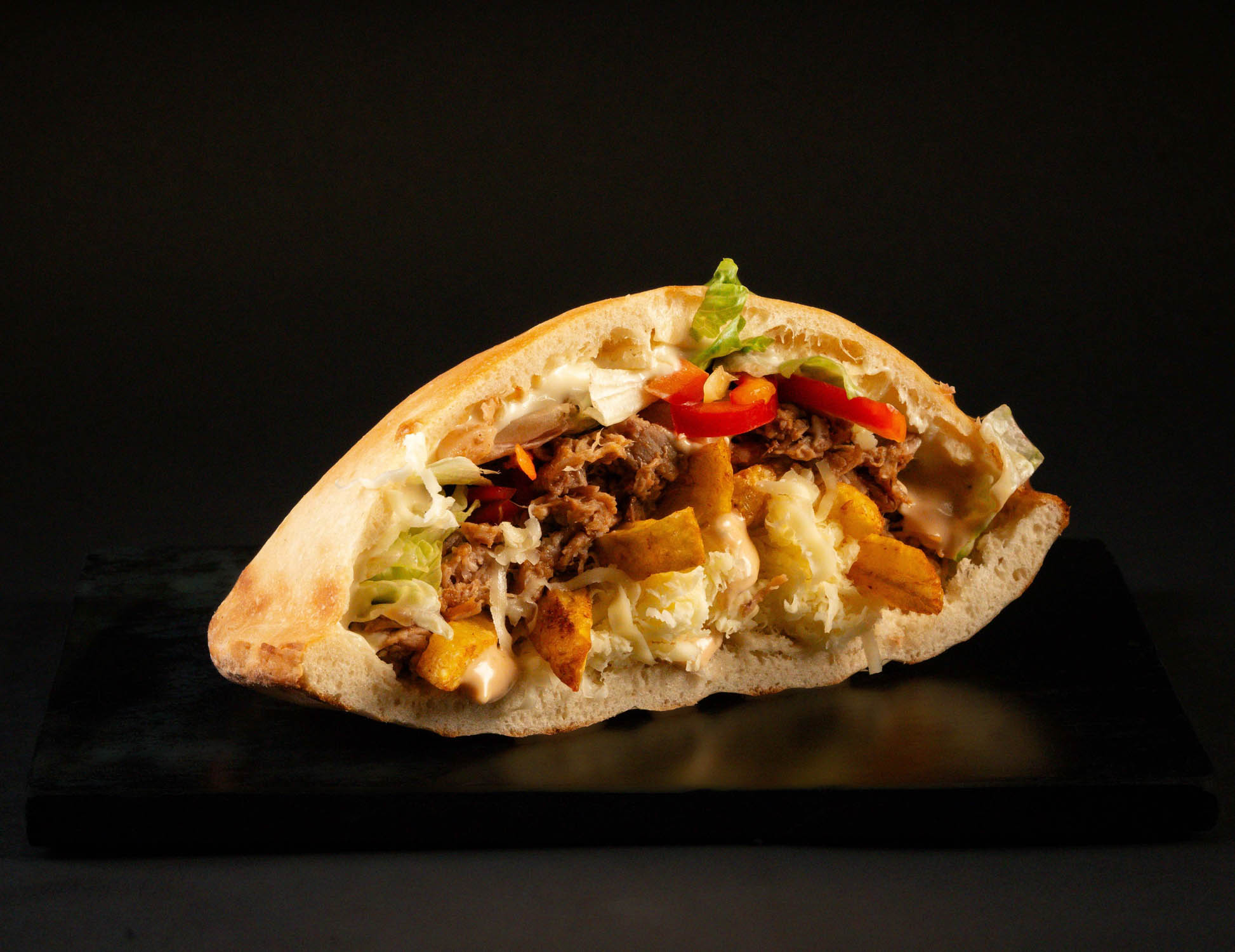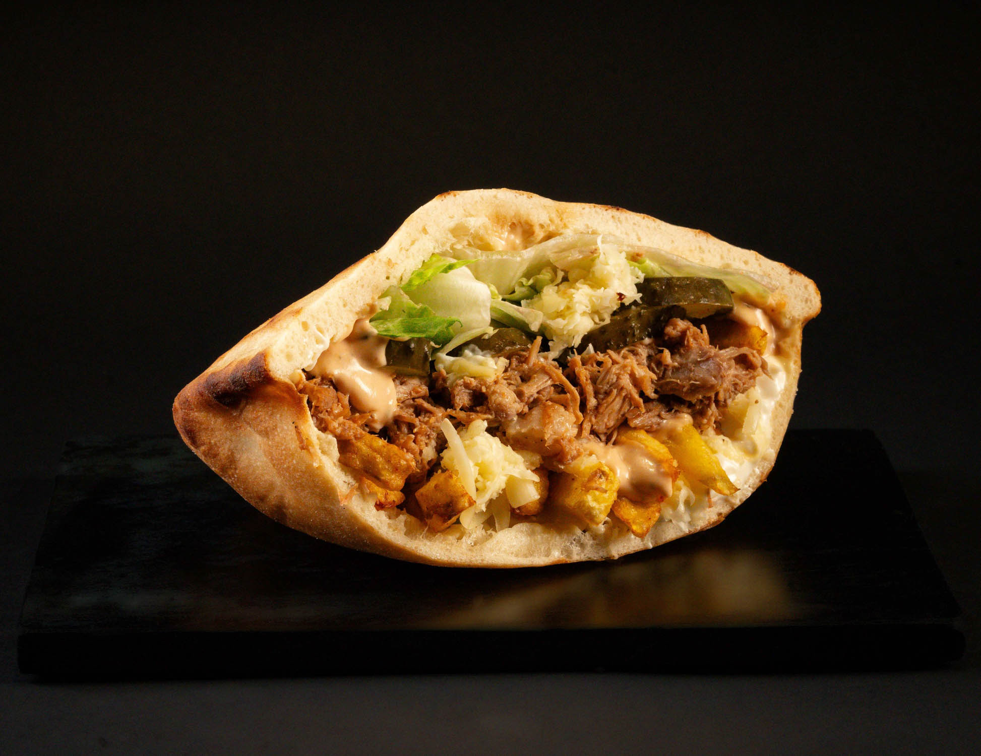 Pâinică la cuptor, carne de oaie slow-cooked, cartofi proaspăt prăjiți, mozzarella, salată iceberg, castraveți murați, sos maioneză cu usturoi
