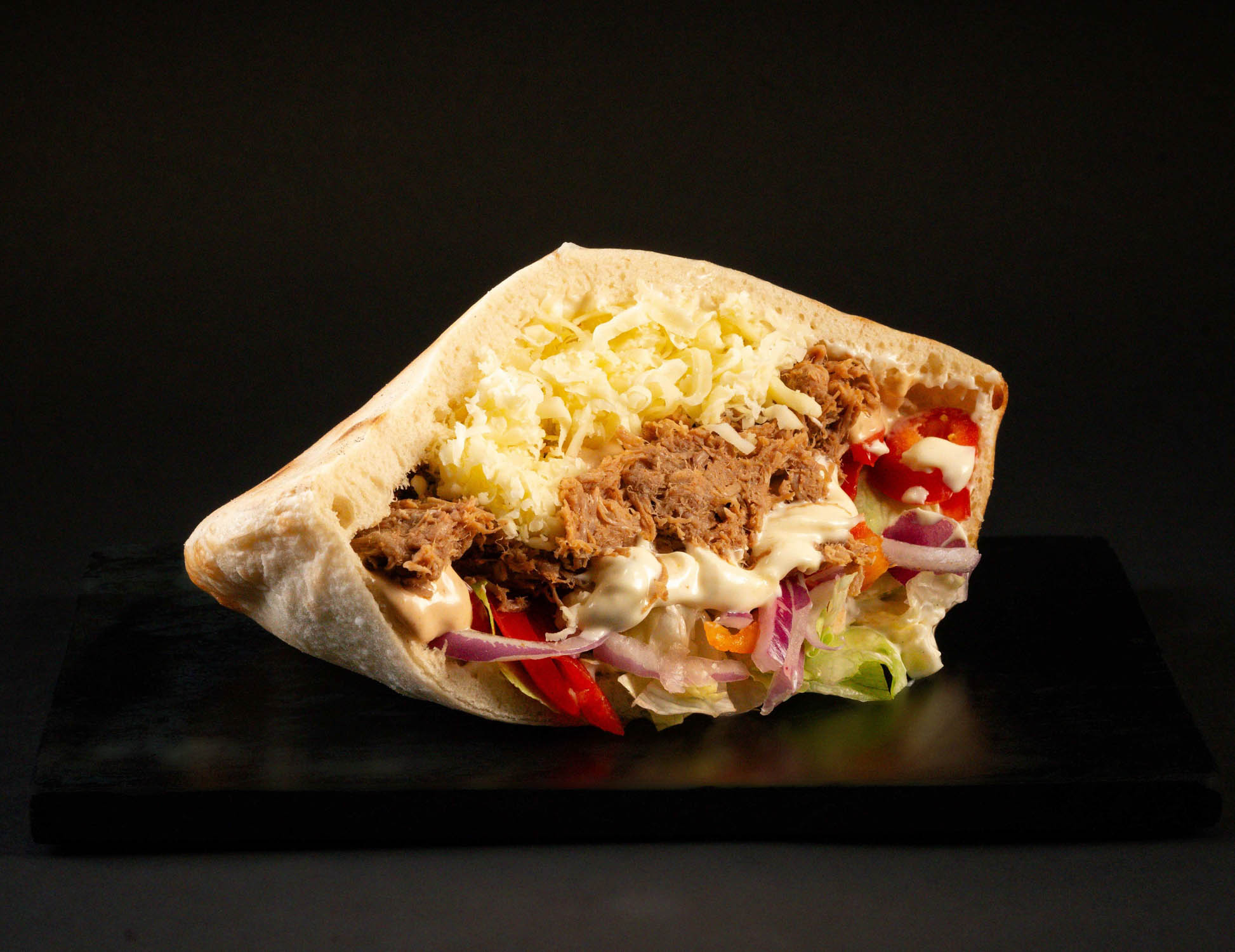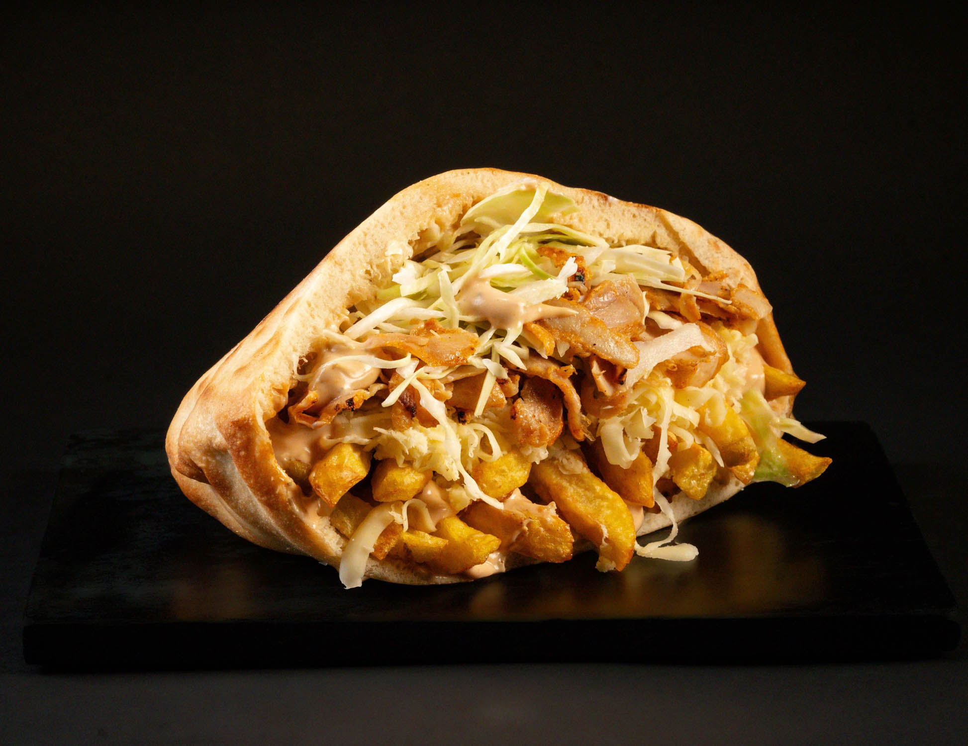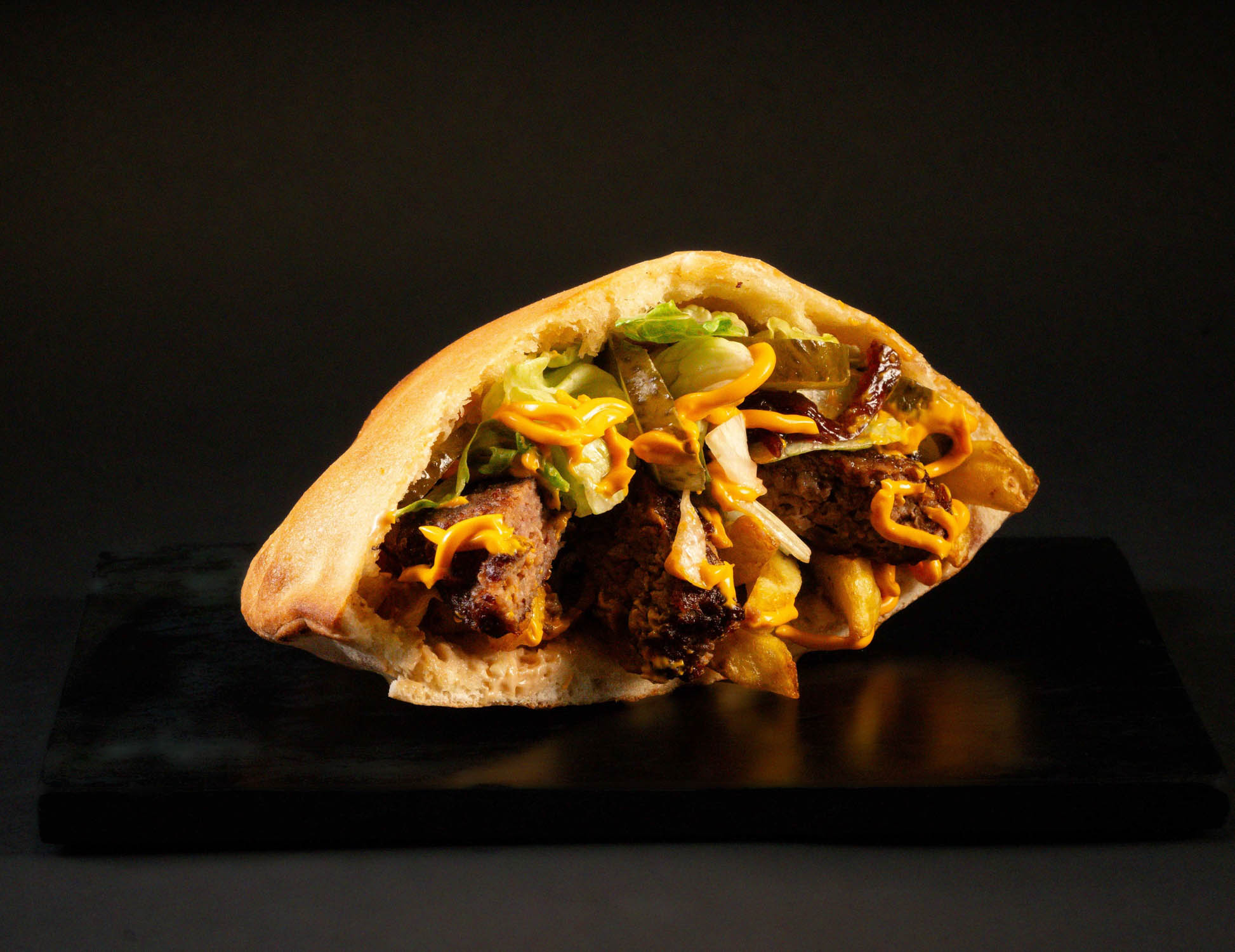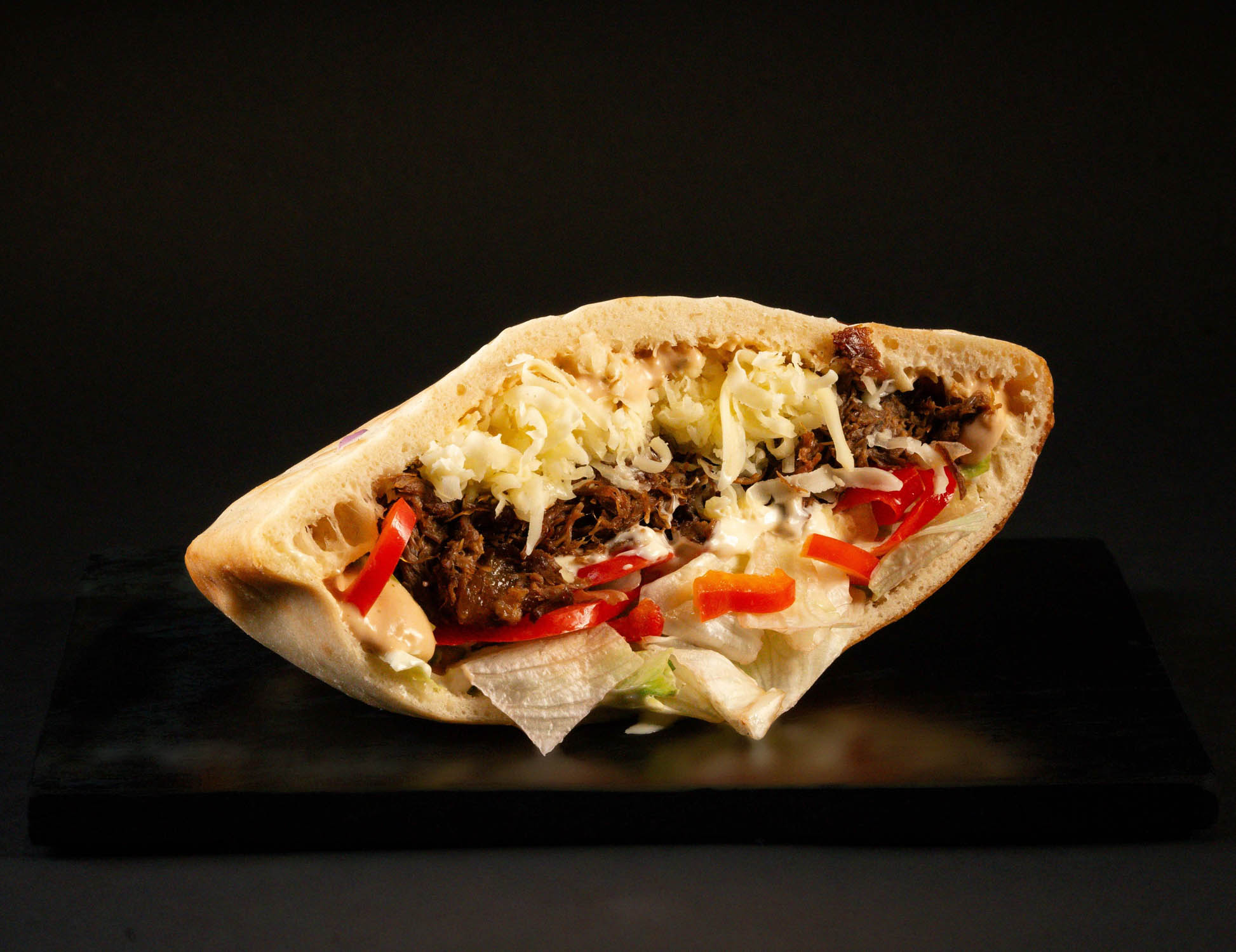 Pâinică la cuptor, carne de oaie slow-cooked, cartofi proaspăt prăjiți, mozzarella, salată iceberg, castraveți murați, sos maioneză cu usturoi