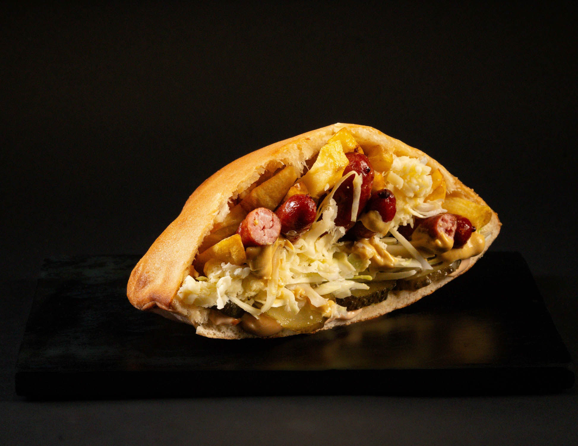 Pâinică la cuptor, cârnăciori prăjiți, mozzarella, salată de varză, castraveți murați, cartofi proaspăt prăjiți, sos de muștar, sosul casei