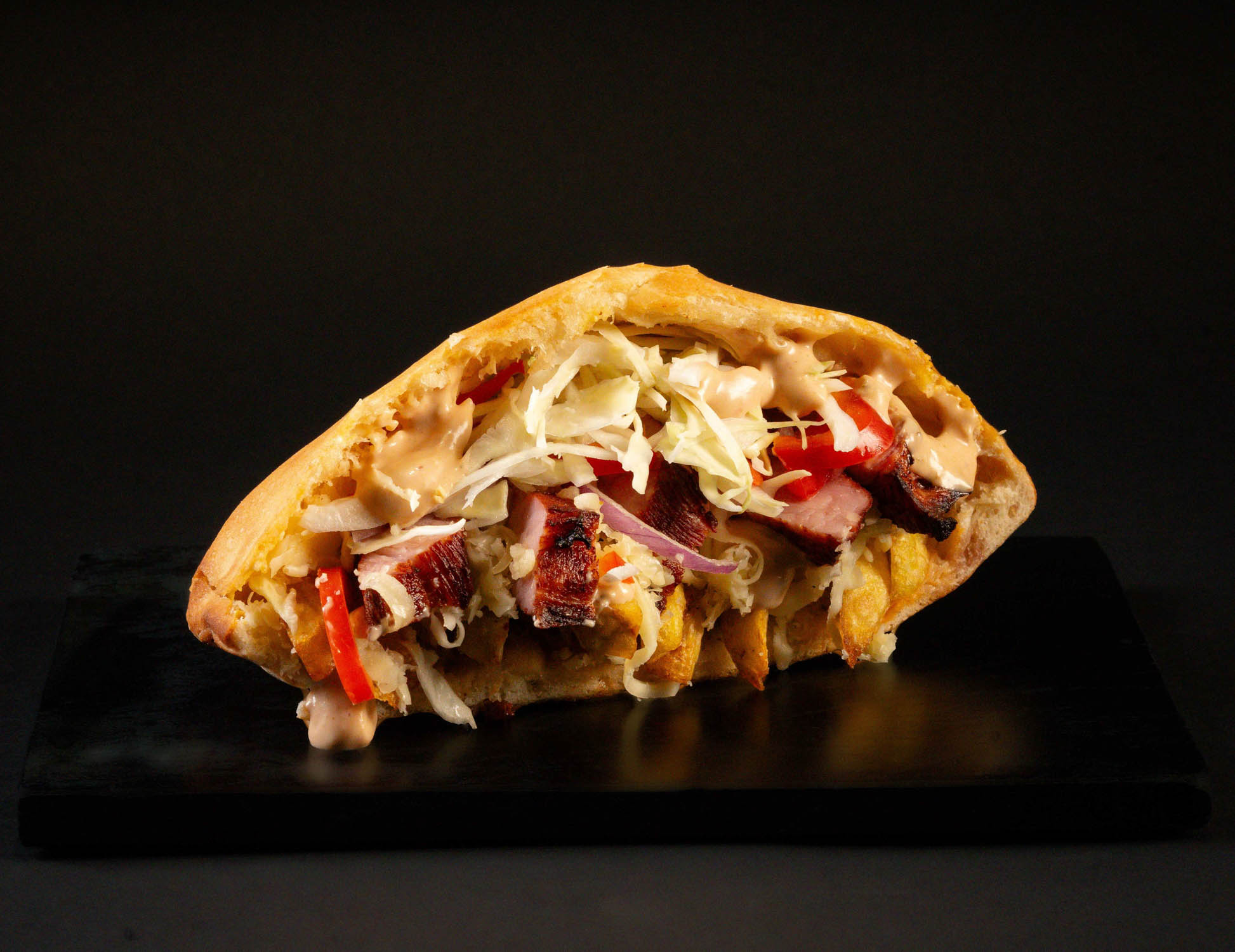 Pâinică la cuptor, vită slow-cooked, cartofi proaspăt prăjiți, mozzarella, ardei colorat, iceberg, sos tartar