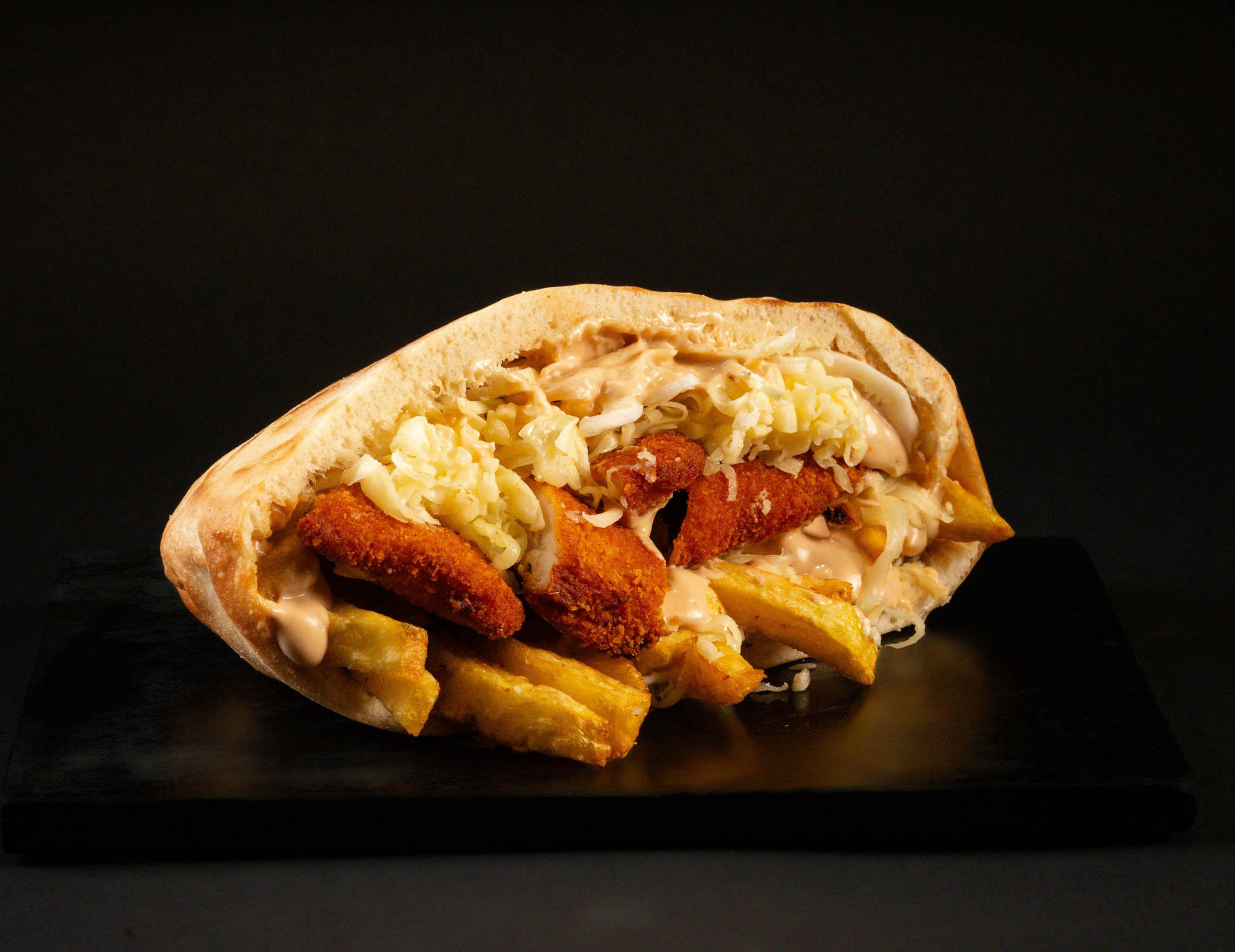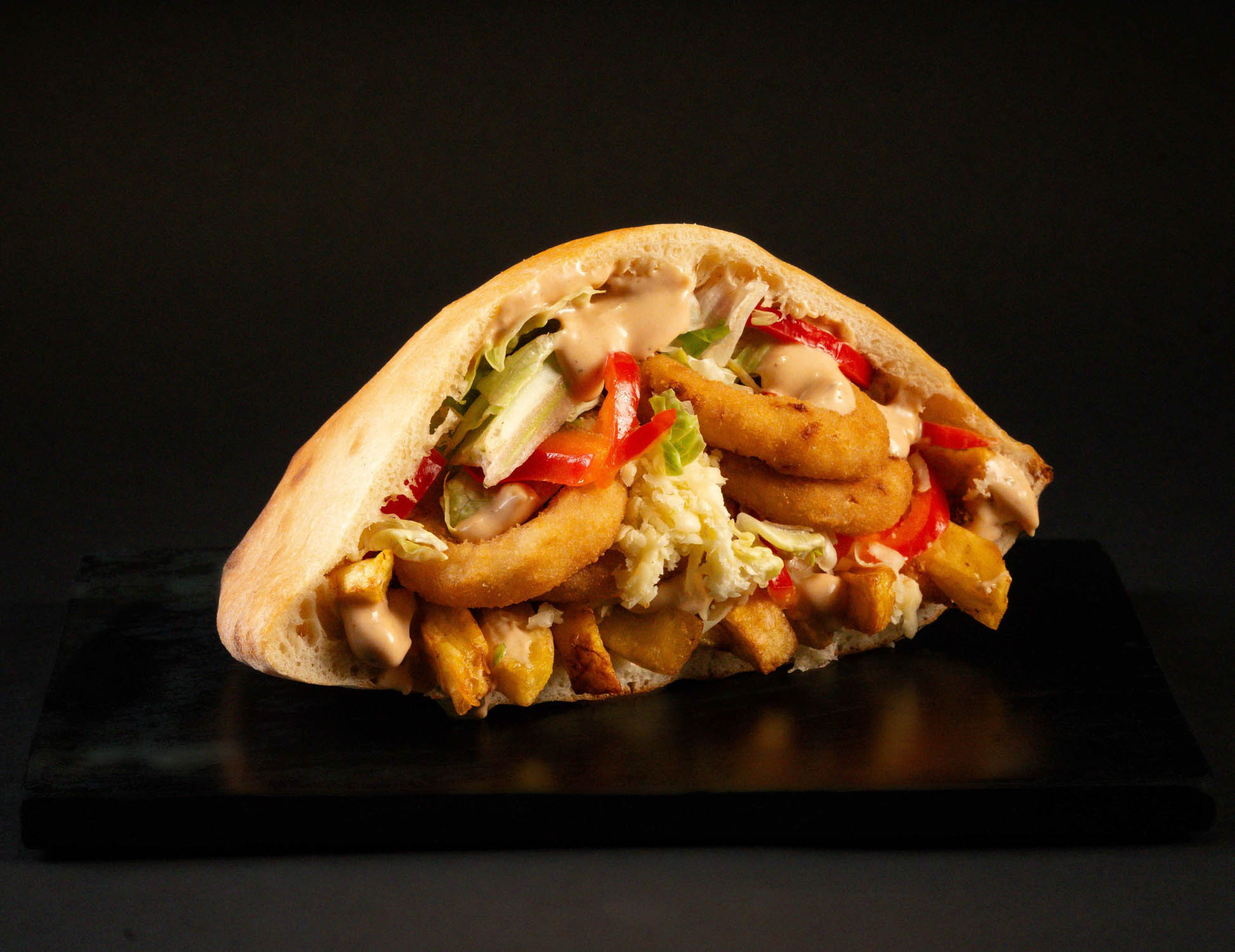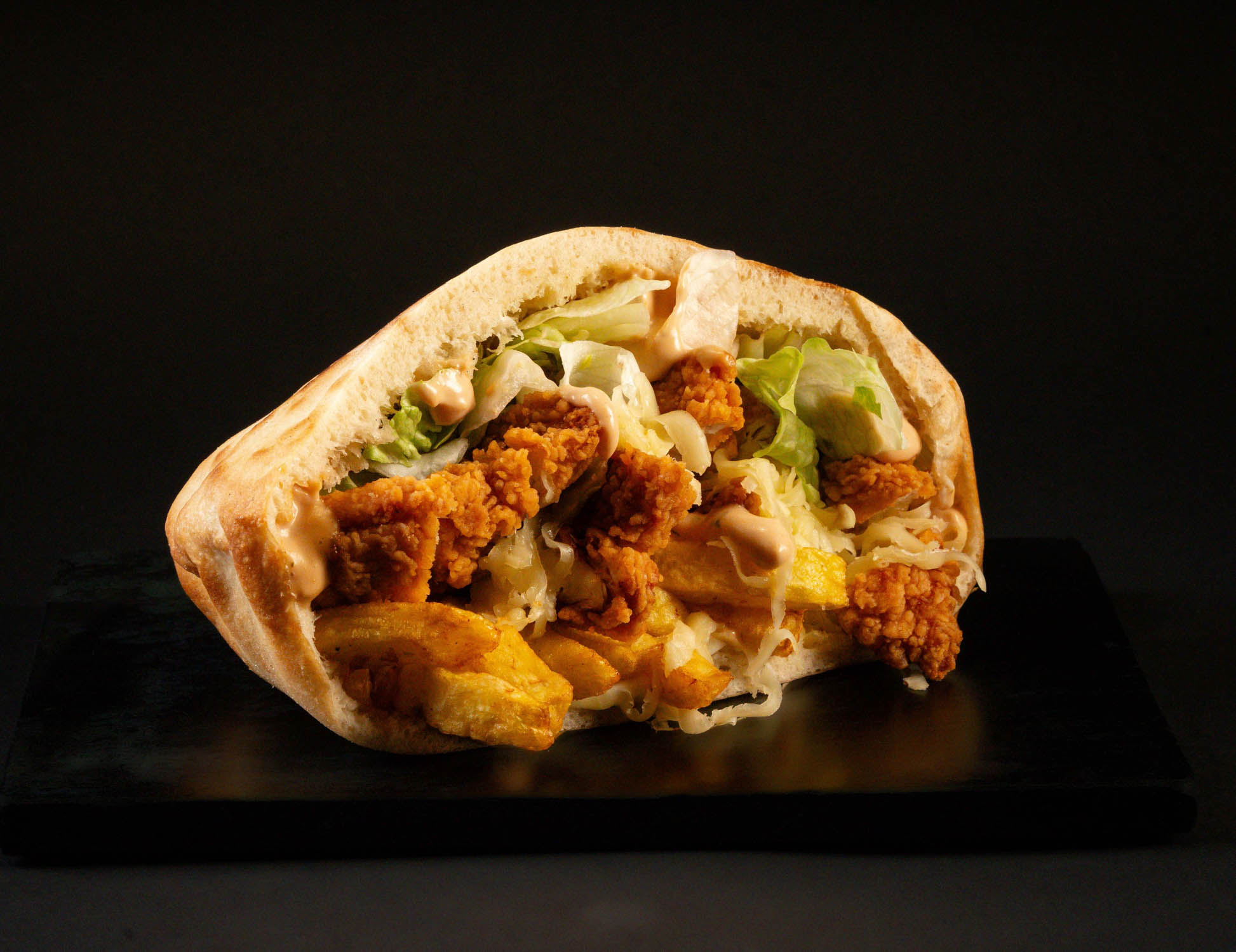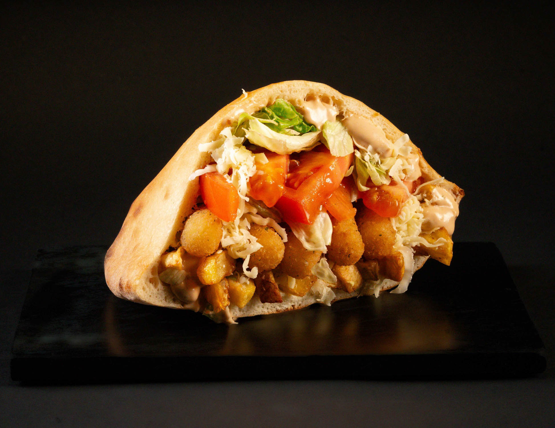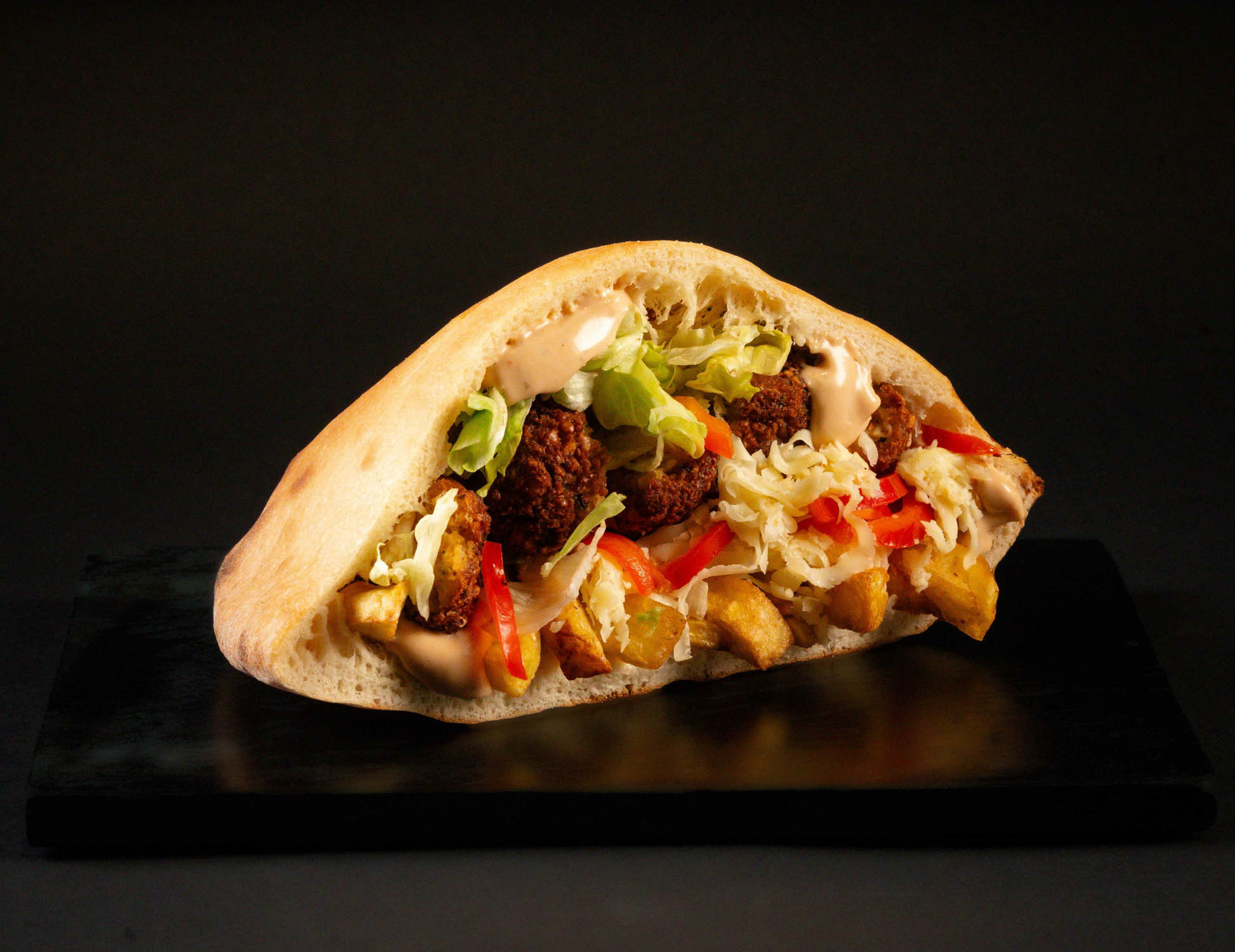 Pâinică la cuptor, falafel, mozzarella, salată iceberg, ardei colorat, cartofi proaspăt prăjiți, sos de maioneză cu usturoi, sosul casei