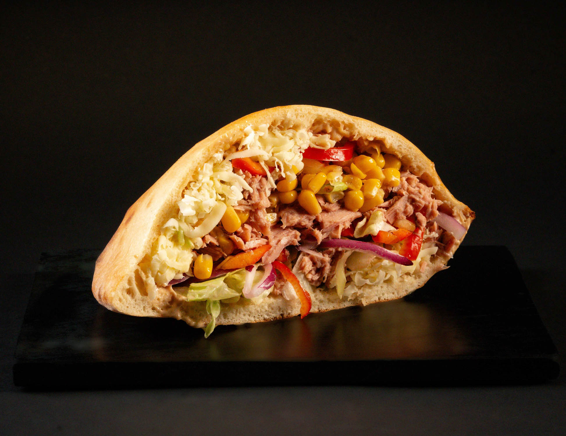 Pâinică la cuptor, ton bucăți, mozzarella, salată iceberg, ceapă roșie, porumb, sos tartar
